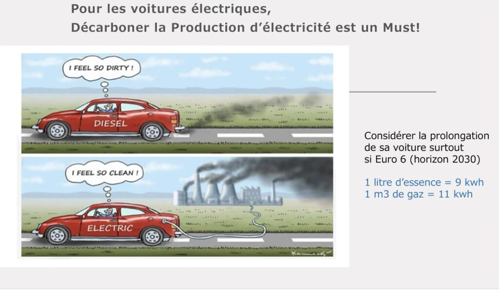 Le dessin ci-dessus rappelle l’absurdité que représente l’utilisation d’appareils électriques, si la source de cette électricité est encore fossile.