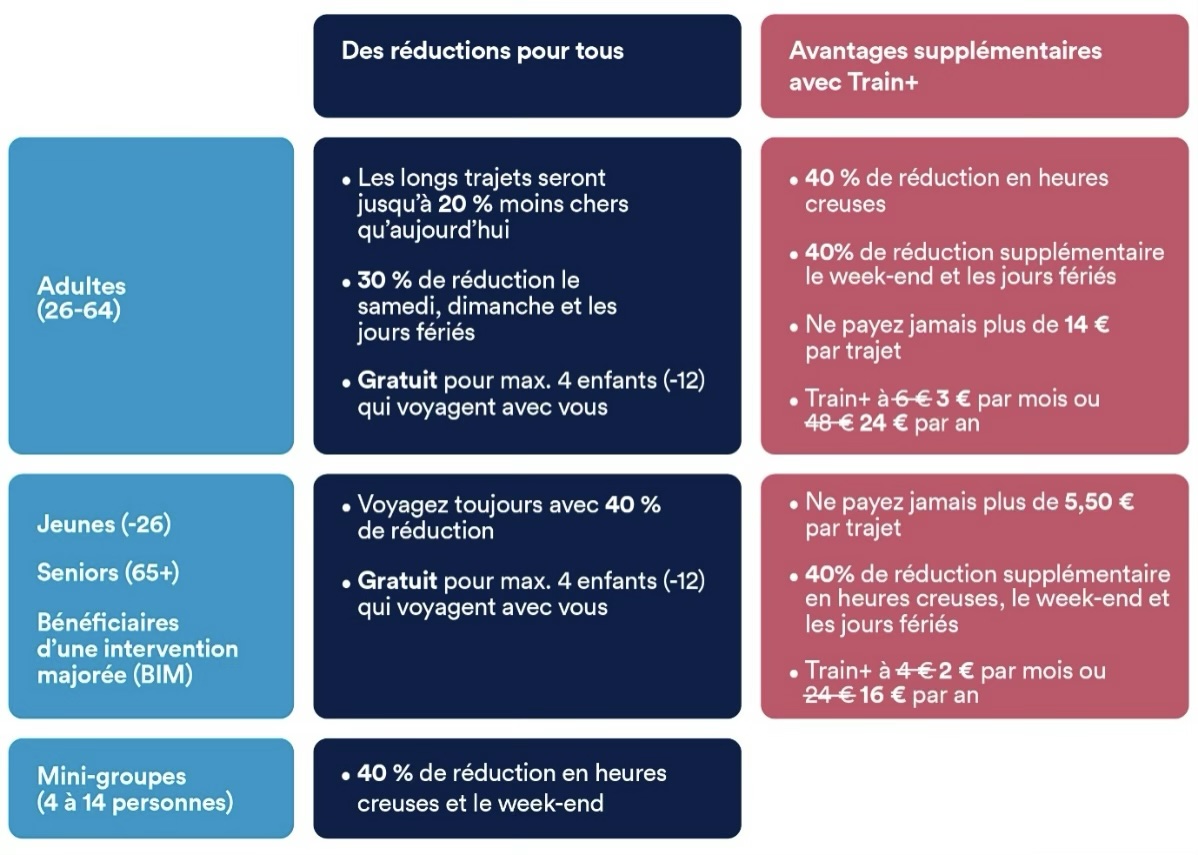 Il est permis d’affirmer que les seniors, les jeunes, les bénéficiaires d’intervention majorée bénéficient de 40% de réduction, dans tous les cas, et d’une réduction supplémentaire via la carte Train+. Les familles pourront aussi recourir à la formule « petits groupes ».
