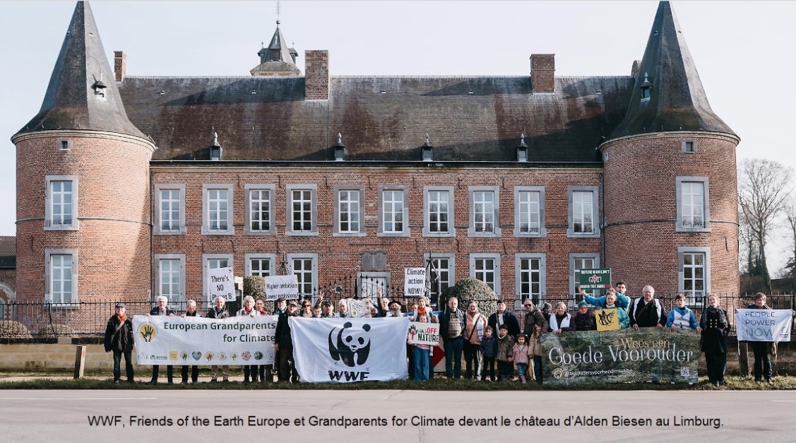 Le 4 février dernier, par un mercredi ensoleillé, nous étions une trentaine de Grands-Parents flamands (surtout) et francophones – avec quelques petits-enfants – à répondre à l’initiative du WWF Europe et des Amis de la Terre. Une action était organisée devant le château et dans la belle nature des environs, pour exprimer notre inquiétude devant les risques de détricotage du Pacte Vert européen.
